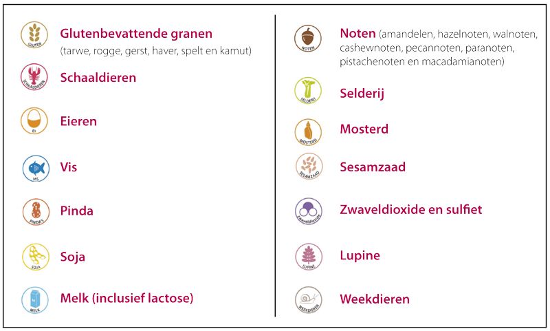 Door de Europese Unie is bepaald dat de allergenen die de meeste overgevoeligheidsreacties veroorzaken vermeld moeten worden. De onderstaande 14 allergenen moeten worden opgenomen in de allergenendeclaratie: